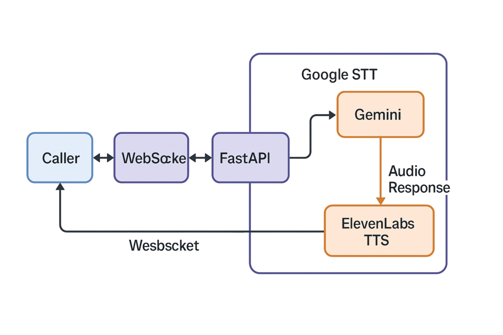 Caller ⇄ Twilio ⇄ WebSocket ⇄ FastAPI ⇄ Google STT → Gemini → ElevenLabs TTS → Audio Response ⇄ Twilio ⇄ Caller